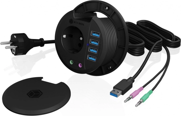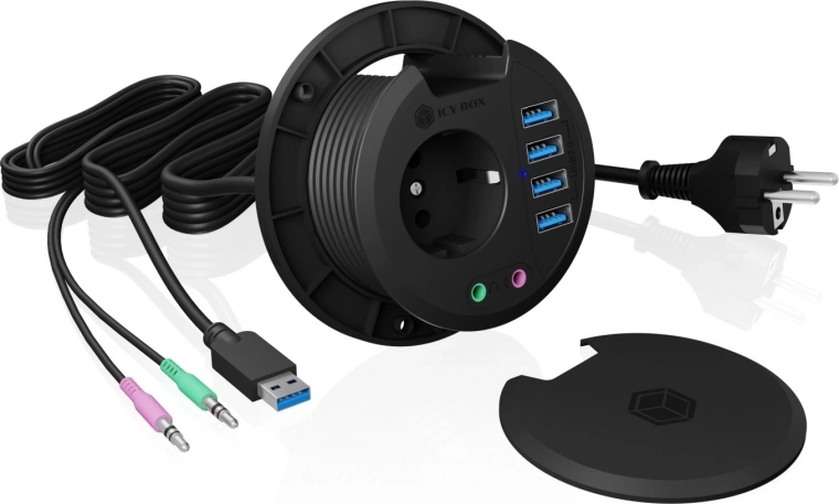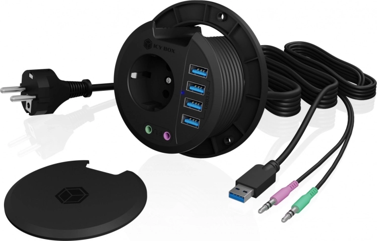 De inbouwhub ICY BOX verandert een standaard kabeldoorvoer met een diameter van 80 mm in een functioneel stroom- en datacentrum. Vier USB 3.2 Gen 1 (Type‑A)-poorten garanderen snelle en betrouwbare synchronisatie en aansluiting van randapparatuur, terwijl het duo 3,5 mm audiopoorten het aansluiten van hoofdtelefoon, headset of microfoon met helder geluid vereenvoudigt.