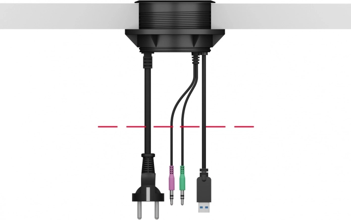 Dankzij het geïntegreerde 230 V stopcontact heb je stroom altijd binnen handbereik. De montage gaat snel – draai simpelweg de klem-schroefring onder het tafelblad vast. De geïntegreerde USB- en audiokabels sluit je direct op de computer aan; optioneel kan een 5V-voeding worden aangesloten voor het opladen van apparaten.