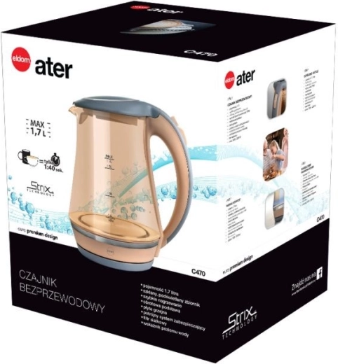 Geniet van de perfecte combinatie van stijl en functionaliteit. De glazen ELDOM C470 waterkoker met subtiele verlichting past perfect in een moderne keuken en brengt dankzij het vermogen van 1850–2200 W water in een oogwenk aan de kook. De hoogwaardige STRIX-regelunit zorgt voor een lange levensduur en storingsvrije werking.