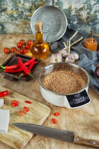 Praktische elektronische keukenweegschaal met een maximaal draagvermogen van 5 kg en een nauwkeurigheid van 1 g voor precies bakken en gezond koken. Dankzij de roestvrijstalen kom is ze gemakkelijk te reinigen, heeft een groot, goed leesbaar display, een tara-functie, automatische en handmatige uitschakeling en kan ze het volume van water en melk meten.