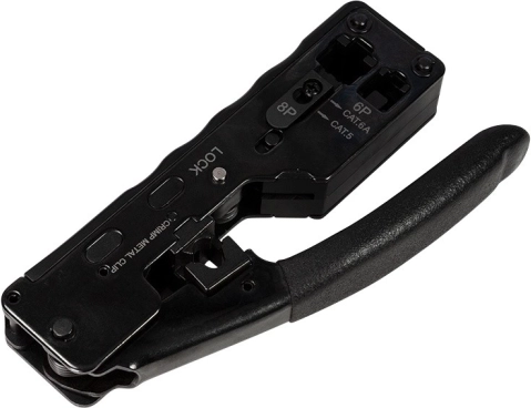 Universele krimptang voor telefoon- en netwerkconnectoren voor een snelle en betrouwbare montage van RJ11/RJ12- en RJ45-connectoren (CAT5e/CAT6/CAT6a/CAT7). Dankzij de compacte en duurzame constructie ligt hij prettig in de hand, maakt comfortabel krimpen met handkracht mogelijk en ondersteunt connectoren met metalen clip.