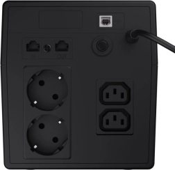 Twee Schuko-stopcontacten en twee IEC-uitgangen dekken verschillende apparaten, USB maakt beheer vanaf de pc mogelijk en RJ45 IN/OUT beschermt netwerkverbinding en communicatie.