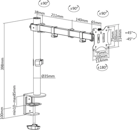 - Draaien van de VESA-houder: 270° (3 scharnieren van 90°)
