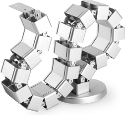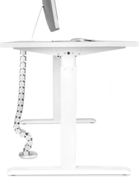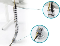 Deze elastische kabelgoot in “ruggengraat”-vorm verbergt en ordent kabels elegant van de vloer tot aan het tafelblad. Dankzij de modulaire constructie kun je de lengte eenvoudig verkorten of verlengen afhankelijk van de bureauhoogte, tot 130 cm. De verzwaarde basis houdt de spiraal stabiel op de vloer, terwijl de flexibele schakels soepel meebewegen bij het verlagen van een in hoogte verstelbaar bureau.