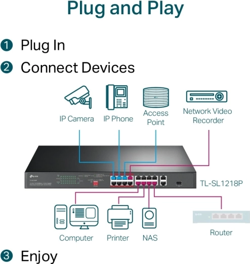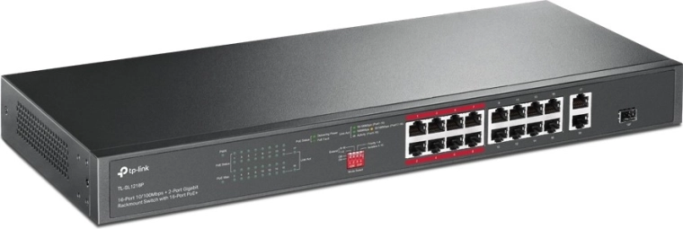 De TP-Link TL-SL1218P is een betrouwbare rackmount-switch voor IP-camera’s, access points en VoIP-telefoons. Hij biedt 16 10/100 Mb/s PoE+-poorten volgens 802.3af/at, twee gigabit-uplinkpoorten (RJ45) en één combo gigabit SFP voor flexibele aansluiting op het backbone-netwerk. Het voedingsbudget van 150 W maakt het mogelijk meerdere apparaten tegelijk zonder problemen van stroom te voorzien.