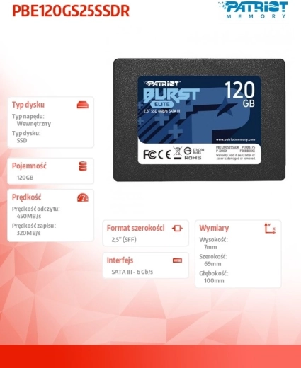 Patriot Burst Elite is een high-performance SSD-schijf ontworpen om uw pc of laptop te upgraden. Deze 2,5" SSD biedt datasnelheden tot 450/320 MB/s en is uitgerust met een betrouwbare SATA III-interface.