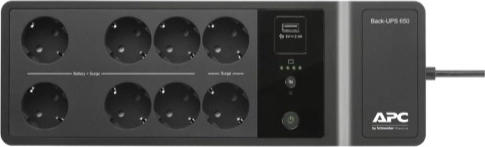 De APC Back‑UPS 650VA (400 W) beschermt je pc, routers, NAS en andere elektronica tegen uitval en spanningspieken. Zes stopcontacten worden gevoed door de batterij en zijn tegelijkertijd beveiligd tegen overspanning, twee extra bieden een afzonderlijke overspanningsbeveiliging. Nauwkeurige frequentieregeling en snelle omschakeling garanderen stabiliteit en veiligheid voor aangesloten apparatuur.