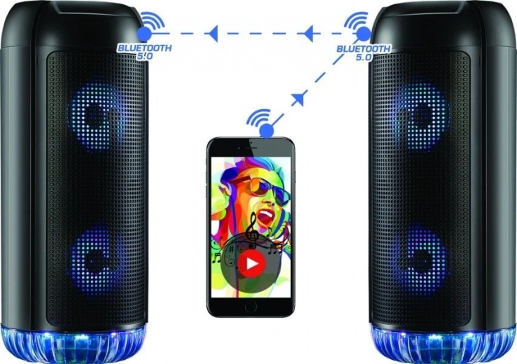 Binnenin bevinden zich 2 × 4" (102 mm) drivers met bassreflex voor krachtigere bassen en heldere hoge tonen binnen 40 Hz – 20 kHz. De ingebouwde Li‑ion batterij van 1200 mAh levert 4–8 uur muziek; opladen gaat gemakkelijk via micro‑USB. De bediening verloopt via multimediaknoppen, een draaiknop en een duidelijk LED-display. De RGB‑verlichting van de luidsprekers en de voet kan worden uitgeschakeld door de M-knop lang ingedrukt te houden.