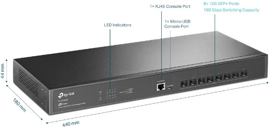 TP-Link presenteert een beheerde switch van topkwaliteit met acht SFP+-sloten met een snelheid van 10 Gb/s. Deze switch biedt een non-blocking schakelcapaciteit van 160 Gb/s, ideaal voor vereiste hogesnelheids- en grootschalige netwerktrafiek.