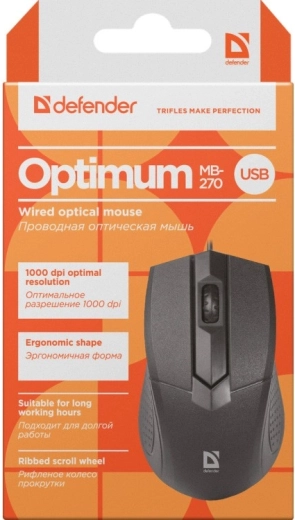 De praktische bedrade muis DEFENDER Optimum MB-270 biedt nauwkeurige bediening dankzij een optische sensor van 1000 DPI, een betrouwbare bekabelde verbinding en 3 knoppen voor comfortabel dagelijks gebruik.