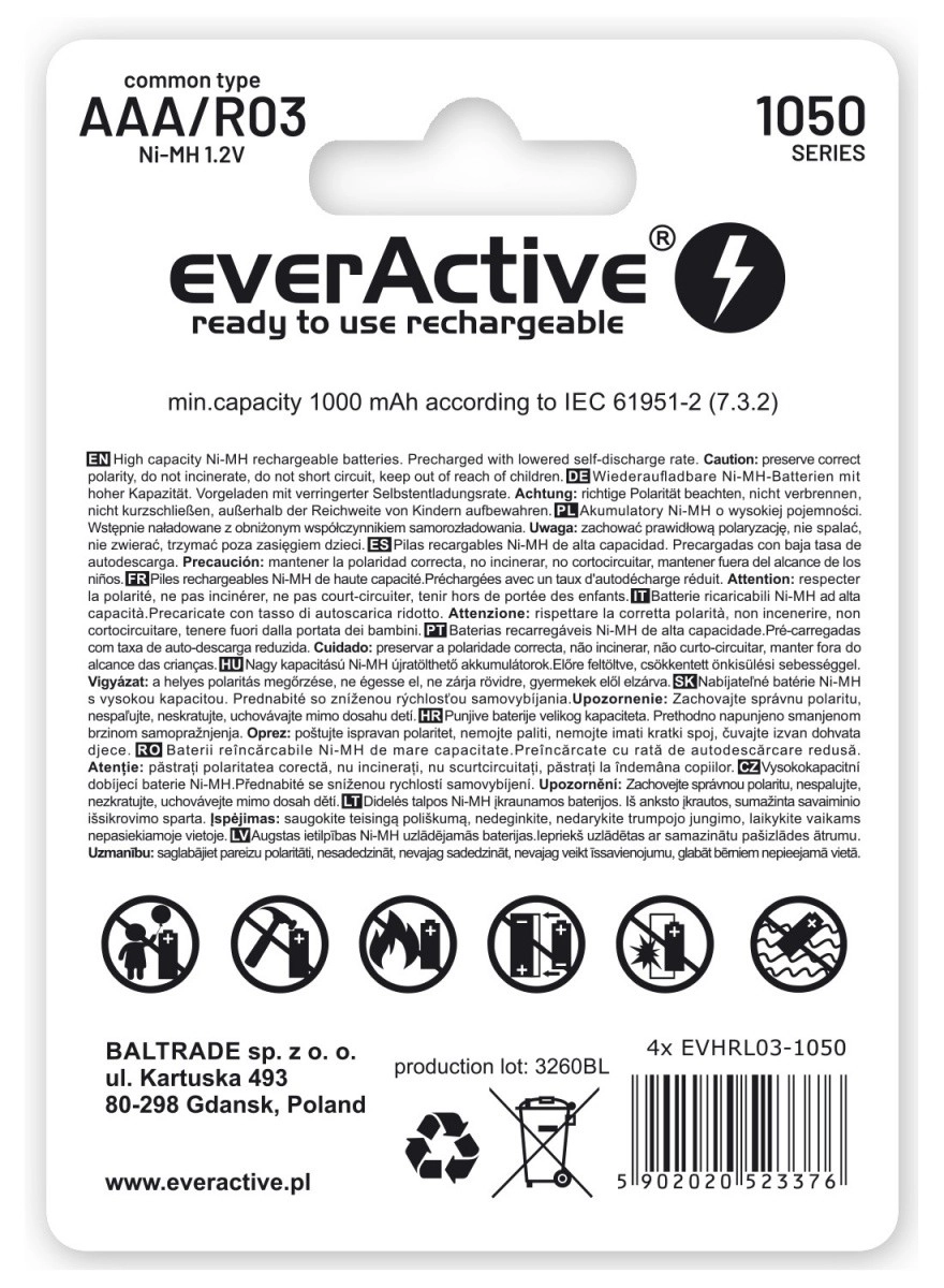 - Hoge capaciteit 1050 mAh – maximum in de R03/AAA-categorie voor langere werktijd.
