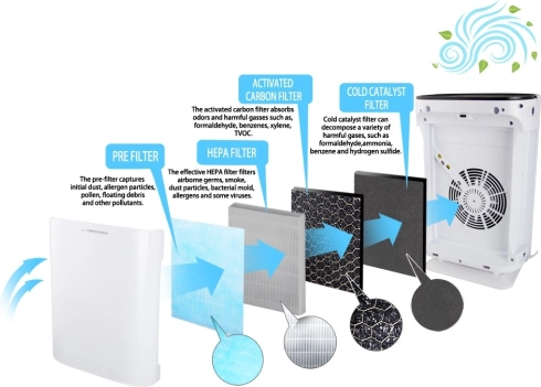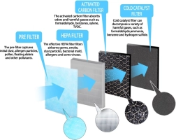 Vangt tot 99,97% van allergenen, pollen en stof dankzij het 4-traps filter: voorfilter, actief koolfilter, HEPA H11-filter en koud katalytisch filter.