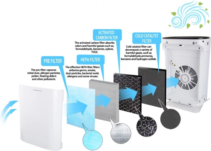 De luchtreiniger Esperanza Bora is uitgerust met een 4-traps filtersysteem dat schadelijke stoffen effectief opvangt en de luchtkwaliteit in uw huis verbetert. Negatieve ionen hechten zich aan positief geladen stof- en rookdeeltjes en bestrijden zo effectief bacteriën en virussen.