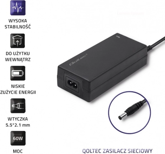 Betrouwbare desktop-voedingsadapter van het merk QOLTEC voor veilige voeding van een brede reeks apparaten. Biedt vermogen van 60 W, uitgang 12 V / 5 A, een standaard connector 5,5 × 2,1 mm en laag energieverbruik dankzij moderne technologieën. Een uitstekende keuze voor monitoren, routers, printers, scanners en andere elektronica.