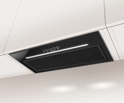 De ingebouwde afzuigkap in het zwart past perfect bij moderne keukens. Het ingetogen uiterlijk sluit naadloos aan op de bovenkasten.
