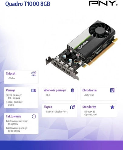 Professionele grafische kaart PNY Quadro T1000 is de ideale keuze voor veeleisende toepassingen dankzij het compacte ontwerp en de hoge prestaties geleverd door de NVIDIA Turing™-architectuur en 896 CUDA-cores.