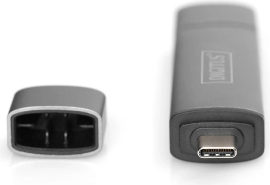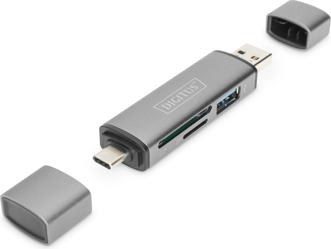 Kaartlezer met USB-hub van het merk Digitus maakt verbinding met smartphone, tablet of laptop voor eenvoudig toegang tot gegevensmedia zoals USB-sticks, SD- en MicroSD-kaarten. Dankzij het Plug-and-Play-ontwerp is geen extra installatie nodig.