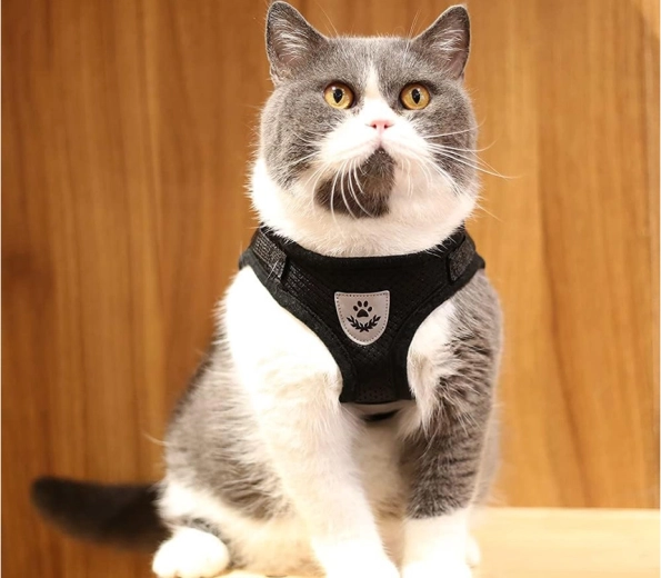Brede, verstelbare banden voor een precieze pasvorm en een afneembare lijn met metalen karabijnhaak voor veilig aanlijnen.