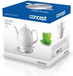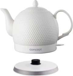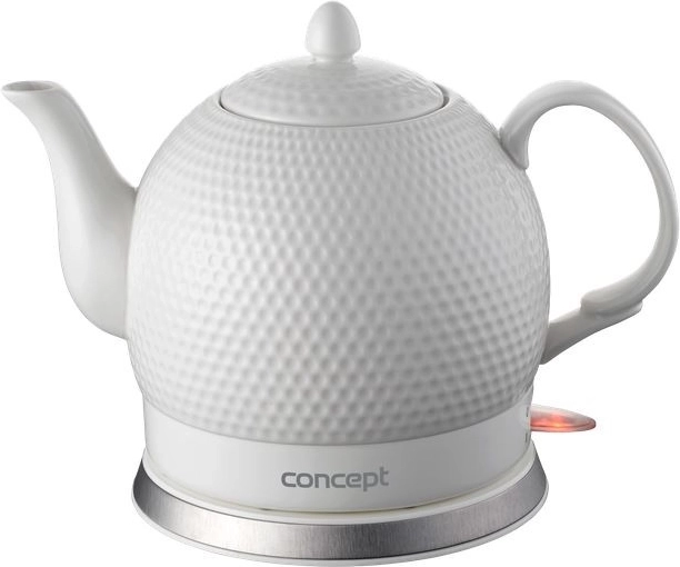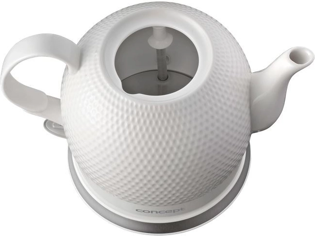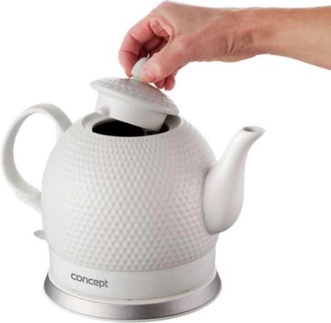 De keramische waterkoker CONCEPT Golf valt op door zijn zuiver witte design met een elegante reliëfstructuur. De traditionele theepotlook wordt aangevuld met moderne functionaliteit: snelle verhitting, comfortabele bediening en veilig gebruik. Keramiek dempt geluid en houdt warmte langer vast, zodat u van een warme drank op de ideale temperatuur kunt genieten.