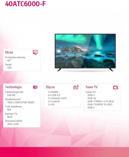 De Allview 40ATC6000-F is een praktische 40″ LED‑tv die een gebalanceerde prijs‑prestatieverhouding biedt. Geschikt voor de woonkamer en slaapkamer, met natuurlijke kleurweergave, degelijke scherpte en stabiele werking. Dankzij de eenvoudige bediening en het overzichtelijke interface geniet je snel van films, sport en spelconsoles.