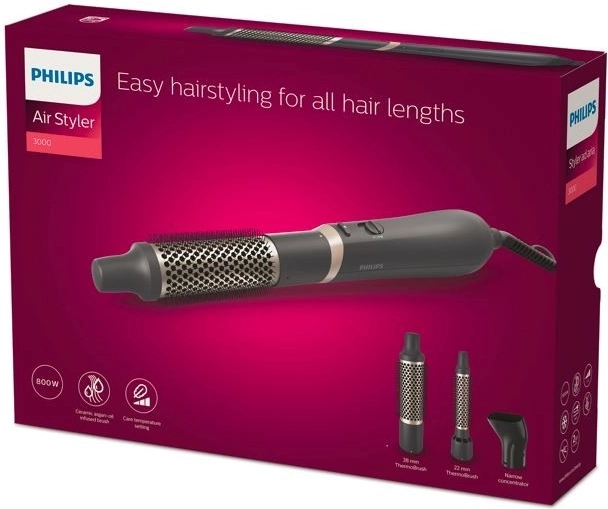 Tegelijkertijd drogen en stylen: de Philips Air Styler Essential maakt het mogelijk om prachtige, natuurlijke kapsels te creëren en biedt haarverzorging. Drie opzetstukken zijn geschikt voor zowel lang als kort haar, waardoor stylen heel eenvoudig is.