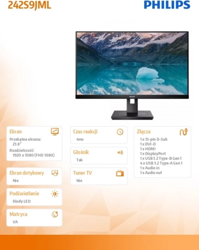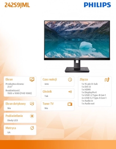 Elegante 23,8" PHILIPS-monitor met VA-paneel biedt een contrastrijk beeld, brede kijkhoeken en comfortabel werken dankzij de ergonomische pivot. Beschikt over universele aansluitingen HDMI, DisplayPort en DVI, smalle randen en een modern design voor thuiskantoor en zakelijke omgevingen.