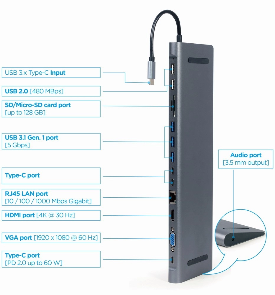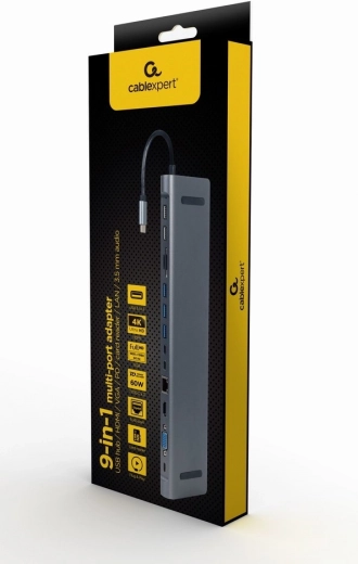 Compacte multi‑poort USB‑C hub 9‑in‑1 in een elegant metalen ontwerp bundelt al je aansluitingen in één apparaat. Biedt HDMI 4K@30 Hz, VGA Full HD, Gigabit LAN, 3x USB 3.1 Gen 1 (5 Gb/s), 2x USB 2.0, USB‑C Power Delivery 60 W, SD/microSD‑kaartlezer en 3,5 mm audio. Eenvoudige Plug & Play zonder drivers.