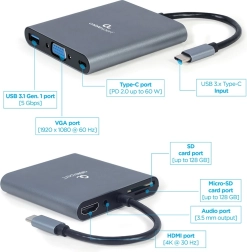 Deze compacte USB‑C hub 6‑in‑1 verandert één poort van je apparaat in een uitgebreide set aansluitingen. Je krijgt een haarscherp beeld via HDMI met ondersteuning voor 4K @ 30 Hz en VGA in Full HD, sluit randapparatuur aan met USB 3.1 Gen 1 (5 Gb/s), luistert via de 3,5mm stereo uitgang en laadt je laptop tegelijk op dankzij USB‑C Power Delivery 60 W (PD 3.0).