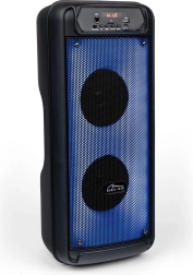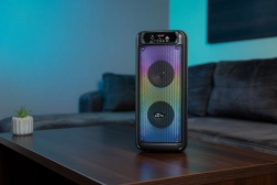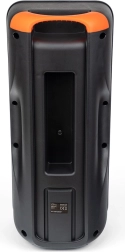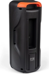 Het doordachte ontwerp bevat een voorpaneel met bedieningstoetsen, poorten voor verschillende aansluitingen en een handige handgreep voor eenvoudig meenemen. De verpakking bevat ook een oplaadkabel en een AUX-kabel.