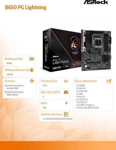 De ASRock B650 PG Lightning is een betrouwbare basis voor een krachtig pc-systeem. Het AM5-platform met ondersteuning voor AMD Ryzen 7000-processoren en vier DDR5-sloten maakt een snelle en efficiënte build mogelijk. De hoogwaardige 14+2+1 vermogensfase met Smart Power Stage en forse heatsinks garandeert stabiliteit, ook onder langdurige belasting.