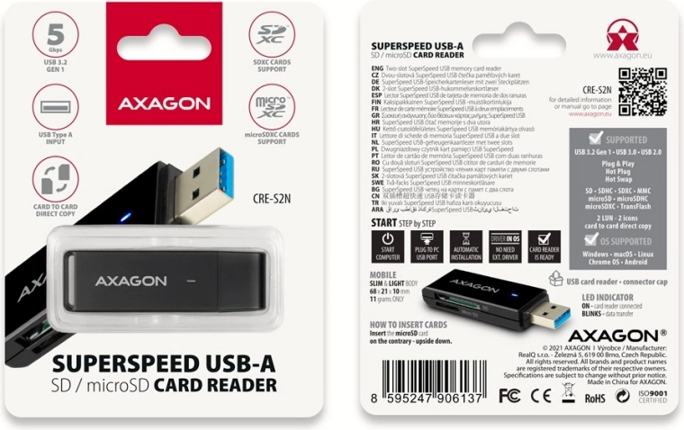 De AXAGON-kaartenlezer biedt hogere overdrachtssnelheden dan lezers met USB 2.0 dankzij de USB 3.2 Gen 1 interface. Ondersteunt gelijktijdig lezen van zowel SD- als microSD-kaartsleuven, wat directe kopiëren tussen kaarten mogelijk maakt.