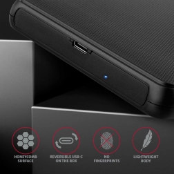 Kunststof behuizing voor eenvoudig plaatsen en wisselen van schijven zonder schroeven. Het oppervlak is krasbestendig en dankzij de foamvoering binnenin biedt het een stabiele en veilige plaatsing van de ingevoegde schijf.