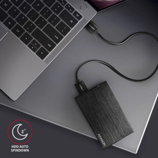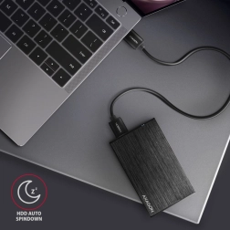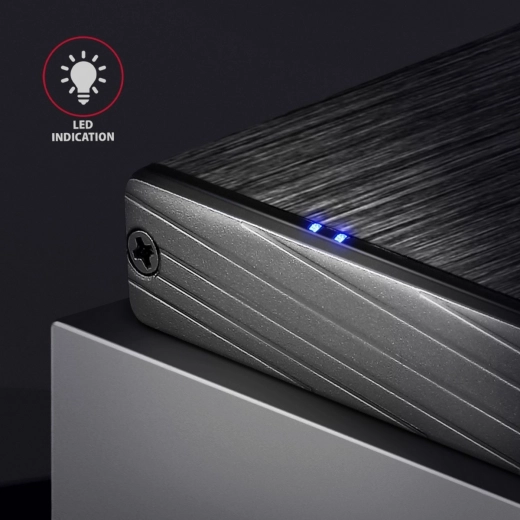 De behuizing biedt HDD Auto Spindown (slaapstand voor de schijf) en HDD Turn Off voor efficiënter energieverbruik. Voorzien van een discrete blauwe LED voor weergave van verbinding en gegevensoverdracht.