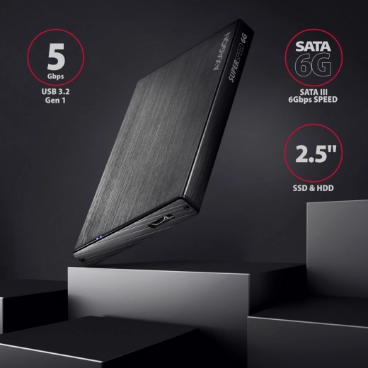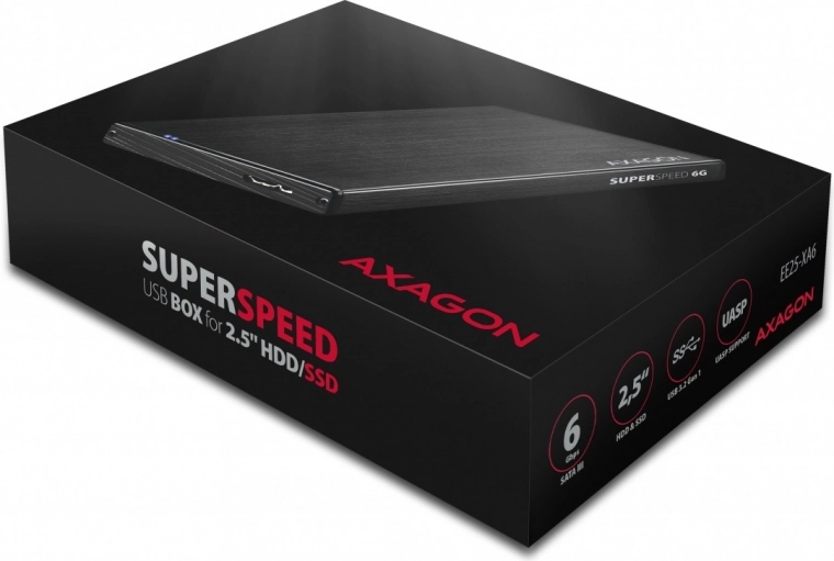 De AXAGON EE25-XA6 ALINEbox behuizing is ontworpen voor 2,5" SATA harde schijven of SSD’s met ondersteuning voor USB 3.2 Gen 1. Dankzij ondersteuning voor UASP en de TRIM-functie worden SSD’s langdurig beschermd en in prestaties geoptimaliseerd. U behoudt niet alleen een elegante stijl dankzij het vingerafdrukbestendige design, maar profiteert ook van betrouwbare bescherming en koeling door de aluminium constructie.