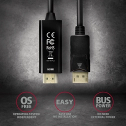 De actieve DisplayPort-naar-HDMI-adapter van het merk AXAGON is de ideale oplossing om je apparaat te koppelen aan een HDMI-monitor of -projector. Deze compacte kabel zorgt voor overdracht van zowel beeld als geluid zonder extra installatie of configuratie. De unidirectionele constructie ondersteunt communicatie van DisplayPort naar HDMI.
