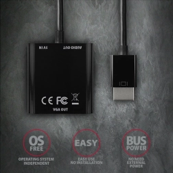 Deze actieve adapter ondersteunt beeldoverdracht tot een resolutie van 1920x1200 (WUXGA) met een verversingssnelheid van 60 Hz. Dankzij het innovatieve ontwerp levert hij een hoogwaardige, scherpe weergave. Hij is eenrichtingsverkeer – van HDMI naar VGA, niet voor omgekeerde conversie.