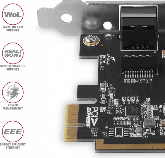 De kaart ondersteunt Plug & Play, hardwareversnelling (Checksum Offload, Large Send), Full Duplex met flow control, VLAN-tagging en verkeersprioritering (802.1P). Verder Auto MDI/MDIX voor automatische detectie van cross-overkabels, LED-indicatie en moderne Wake‑on‑LAN-scenario’s voor extern wekken.