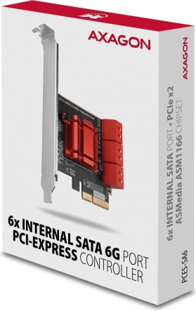 De AXAGON PCIe‑controller met ASMedia ASM1166 voegt aan je pc 6 onafhankelijke SATA III 6G‑poorten toe voor HDD’s, SSD’s en optische stations. Dankzij de ondersteuning van SATA 3.0 zijn overdrachtssnelheden tot 6 Gb/s mogelijk, met behoud van achterwaartse compatibiliteit met SATA 2.0 en SATA 1.0.
