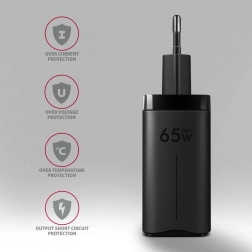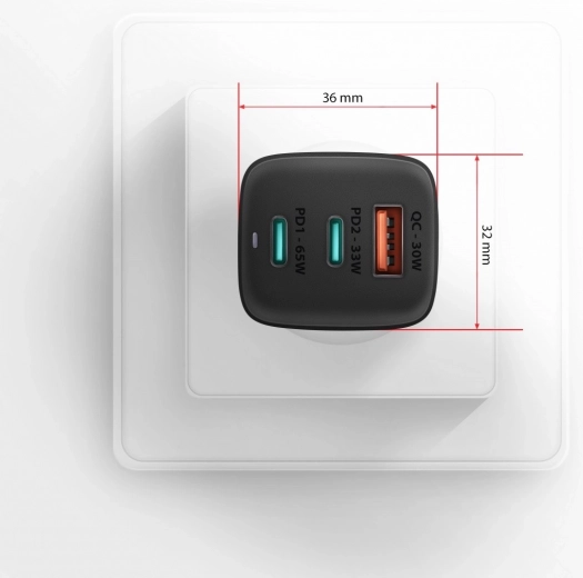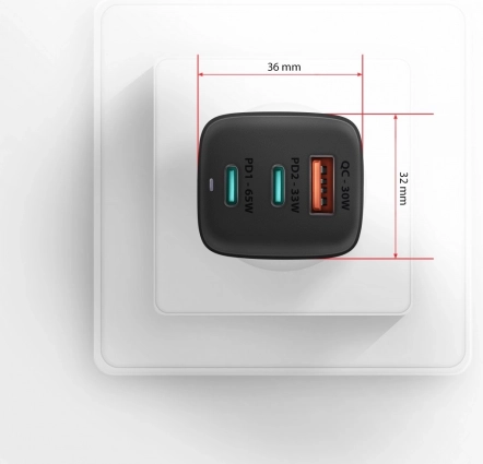 De compacte reislader AXAGON GaN 65W laadt tot drie apparaten tegelijk snel op. Dankzij de GaN-technologie biedt hij hoog vermogen in een klein formaat, twee USB‑C-poorten met Power Delivery 3.0/QC 4+ en één USB‑A met QC 3.0. Ondersteunt PPS, Samsung SFC/SFC 2.0 en Apple PD 20–27W en kan zelfs laptops tot 65W voeden.