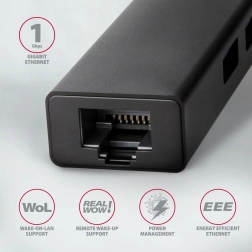 De geïntegreerde netwerkadapter biedt een betrouwbare en snelle bekabelde verbinding, ondersteuning voor geavanceerde functies (VLAN, jumbo frames, checksum offload, Wake‑on‑LAN e.a.) en eenvoudige installatie in Windows 8.1 en nieuwer zonder internet. De compacte aluminium behuizing met fijne textuur is bestand tegen vingerafdrukken en dankzij de 20 cm kabel is de hub perfect voor onderweg – werkt ook met geselecteerde telefoons en tablets met USB‑C/Android.