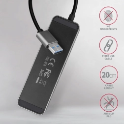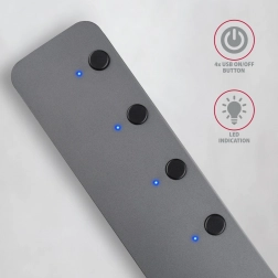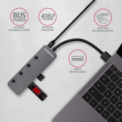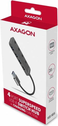 De AXAGON HUE-MSA is een robuuste en stijlvolle USB-hub van aluminium met vier USB-A-poorten op USB 3.2 Gen 1-snelheid tot 5 Gb/s. Dankzij de individuele schakelaars met LED-indicator koppel je ongebruikte apparaten eenvoudig los zonder stekkers te verwijderen. De geïntegreerde micro-USB voor extra voeding verhoogt de stabiliteit bij gebruik van meerdere externe schijven.