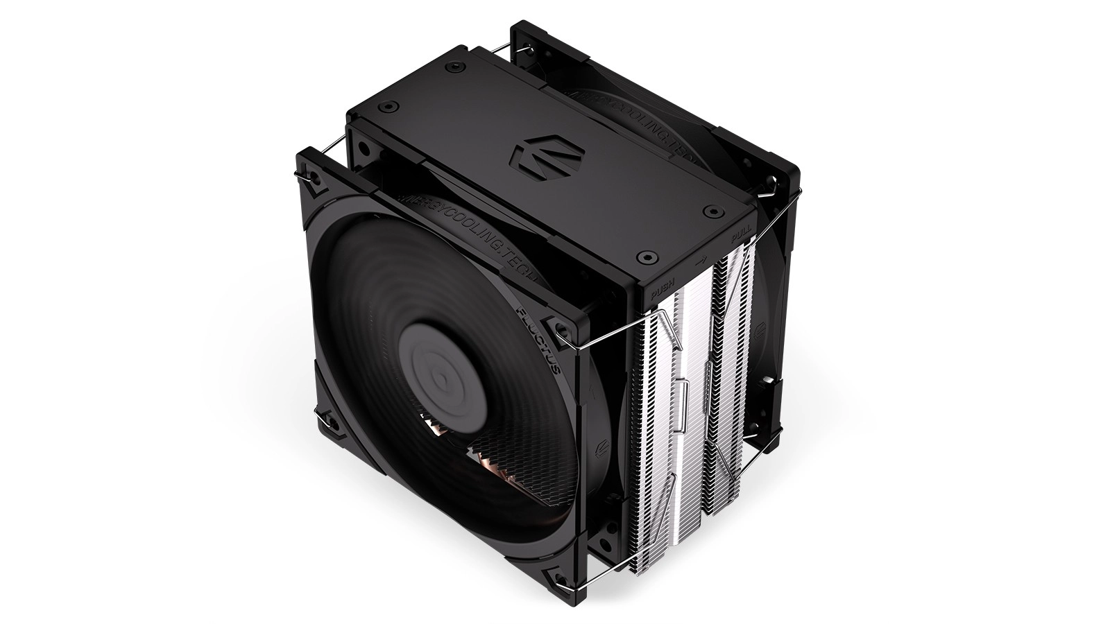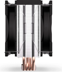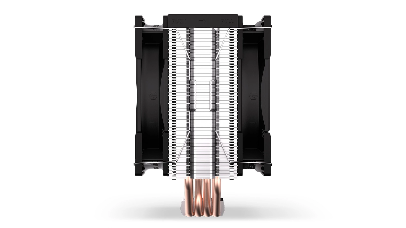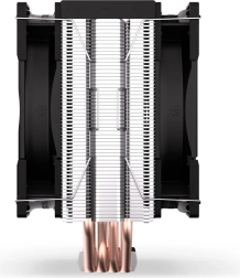 De dicht geribde radiator met compacte basis en vier koperen warmtepijpen voert warmte effectief af van de processor, ook onder langdurige belasting.