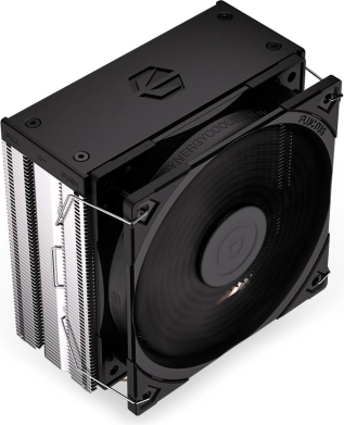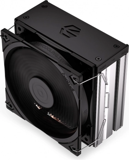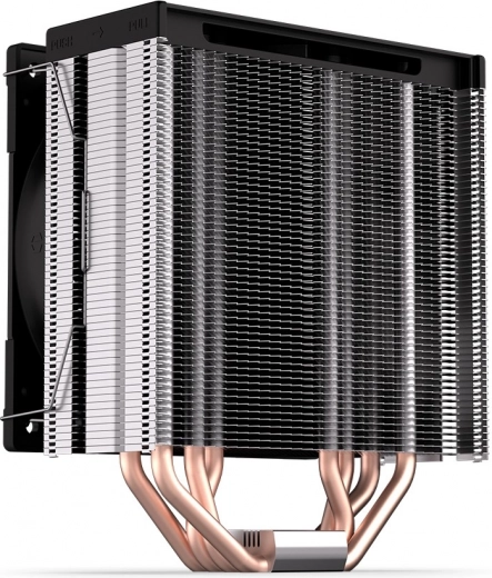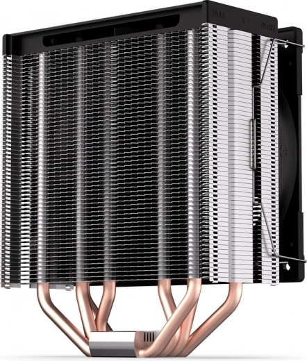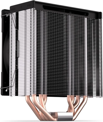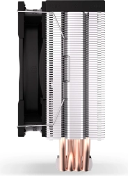 Met een hoogte van ca. 15,5 cm past hij in kleinere behuizingen. De asymmetrische koeler met dichte lamellen en 4 heatpipes houdt de temperaturen laag, ook onder belasting.