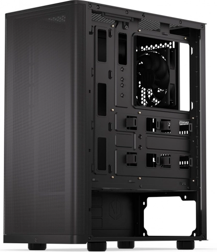 De ENDORFY Ventum 200 Solid is een doordachte pc‑behuizing met focus op efficiënte koeling, eenvoudige montage en een clean uiterlijk. De stalen zijwand beschermt de componenten, terwijl het fijn geperforeerde frontpaneel ruim voldoende lucht doorlaat en stof tegenhoudt. Dankzij de slanke footprint past de behuizing gemakkelijk op of onder het bureau en biedt toch ruimte voor krachtige builds.