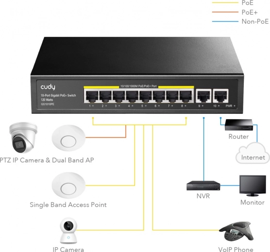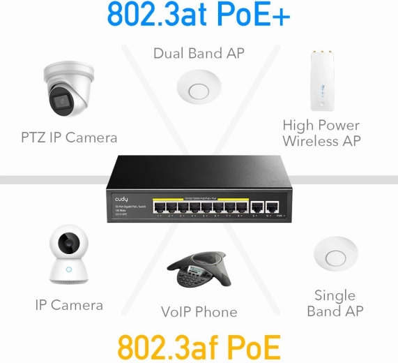 Cudy 10-Poorts Gigabit PoE+ Schakelaar biedt hoge prestaties met een totaal PoE-budget tot 120 watt en levert tot 30 watt per poort, wat ideaal is voor het tegelijkertijd van stroom voorzien van meerdere apparaten.