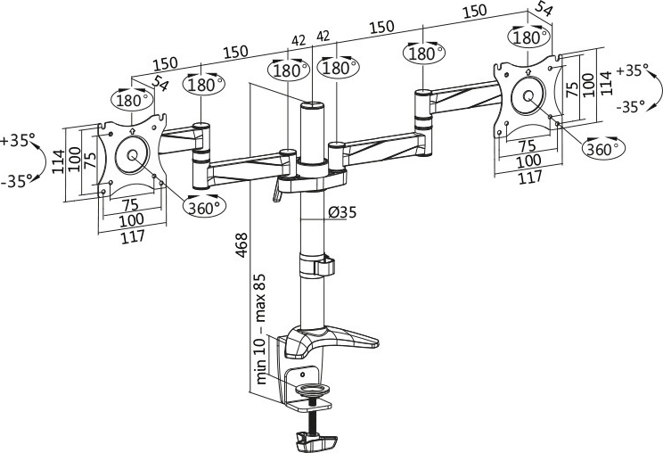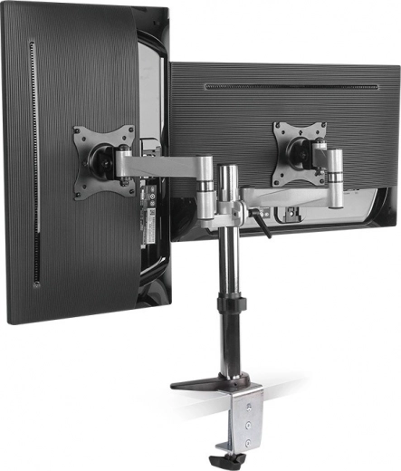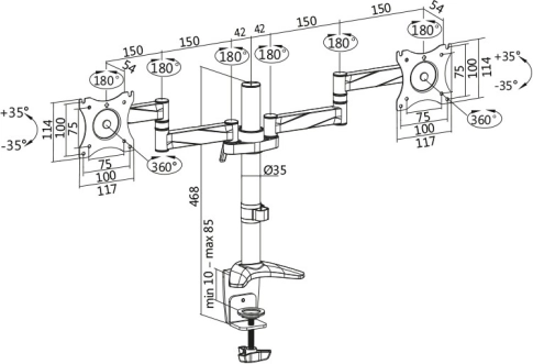 De armen maken het eenvoudig om hoogte, kanteling en rotatie aan te passen, zodat u de schermen snel afstemt op uw postuur en huidige taak. De stevige bureauklem zorgt voor stabiliteit zonder in de muur te boren en bespaart tegelijk ruimte.