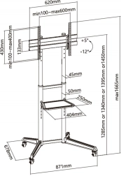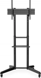 Inclusief een praktische plank voor laptop, speler of settopbox (40,4 × 25 cm, max. 5 kg). Vier zwenkwielen met vergrendeling zorgen voor soepele mobiliteit en stevige fixatie op de plek. Geïntegreerde kabelgeleiding houdt de installatie overzichtelijk en professioneel. De poedercoating verhoogt de slijtvastheid.