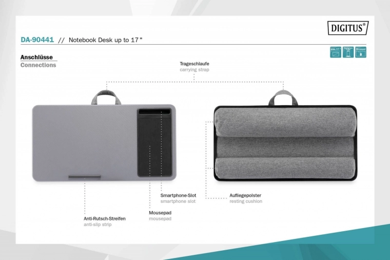 Praktische schootdesk waarmee je overal comfortabel kunt werken – vanaf de bank, in bed of onderweg. Biedt een stabiel oppervlak voor laptops tot 17", een geïntegreerde muismat, een smartphonehouder en zachte padding voor maximaal comfort. Dankzij het praktische handvat neem je hem gemakkelijk mee, terwijl de stoprand aan de onderzijde voorkomt dat je laptop wegglijdt, zelfs bij een lichte helling.