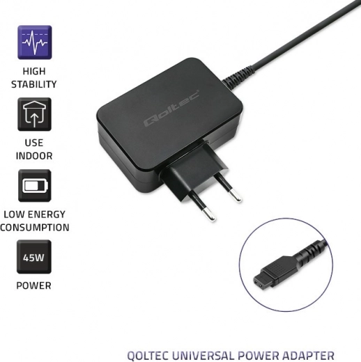 Het moderne en compacte ontwerp van de Qoltec-adapters is geschikt voor makkelijk transport en gebruik onderweg.