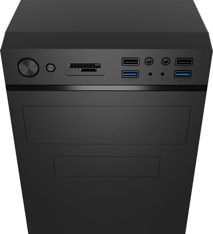 Het voorpaneel met 4 USB-poorten, waaronder 2 USB 3.0-poorten, biedt comfortabel aansluiten van apparaten. Er zijn ook 3,5 mm-aansluitingen voor microfoon en hoofdtelefoon en een geïntegreerde SD- en microSD-kaartlezer.